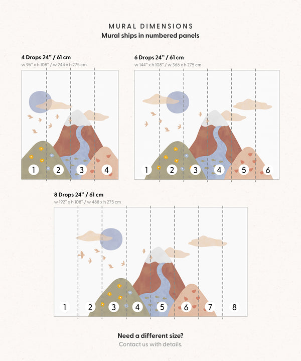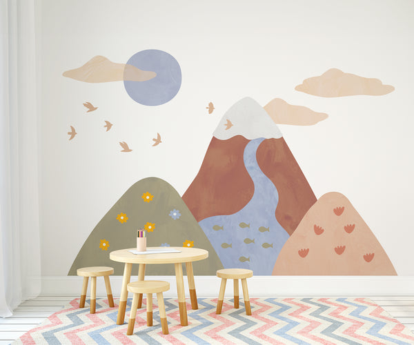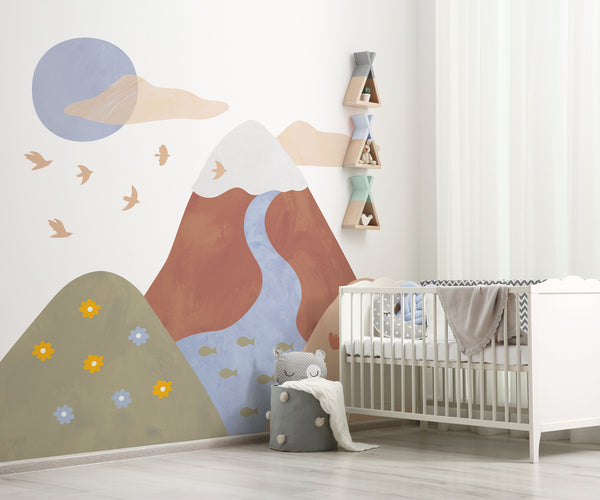 Introduce a sense of tranquility and wonder to your child's space with our Mountain Landscape Wall Mural. Crafted in soothing earthy tones, this mural brings the majestic beauty of nature indoors. Perfect for nurseries or playrooms, it inspires imaginative adventures amidst towering peaks and serene landscapes. Elevate your child's room with the timeless charm of our Mountain Landscape mural today!