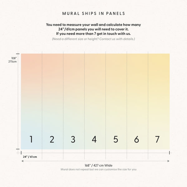 Our Murals ship in Panels, so the number of panels will depend on the area you need to cover. Each panel is 24” | 61 cm wide. If you need more than 7 panels let us know.